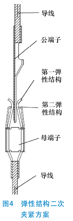 如圖4所示,該方案的第(dì)一彈性(xìng)結構與常規方案的彈性結構具(jù)有相同的工作原理一一通過(guò)母端子的彈性結構夾緊公端子頭部,使電(diàn)路導通,彈性(xìng)結構由母端(duān)子在衝壓成型(xíng)過程中同時成型,與母端子的材料一(yī)致(zhì),一般為銅合(hé)金材