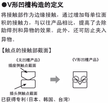 2、 采用(yòng)V形凹槽+雙觸點構造,耐異物性強。