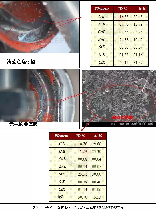 通電、高溫、潮濕、氯離子存在的條件下,連接器內部金屬構件發生了表麵鍍銀層(céng)的電遷移和(hé)主體材料的腐蝕,產物在電場的作用(yòng)下附著在絕緣組件(jiàn)上並將外金屬套(tào)殼和與內金(jīn)屬觸條(tiáo)一體的金屬(shǔ)構件連接,從而導致連(lián)接器絕緣阻值大幅(fú)降(jiàng)低失效。