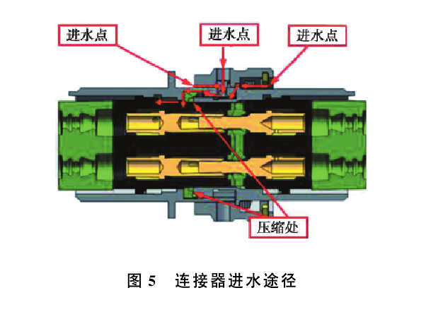 空調室外風機連接器由插頭和插座組成。插頭由殼體組件、絕緣(yuán)體組件、封線體、卡爪、插針、連接螺帽等零件組成,插座由(yóu)方盤殼體、殼體密封圈、絕緣體組件、封線體、插孔(kǒng)組件等零件組(zǔ)成。根(gēn)據連接(jiē)器拆解情況分析,壓縮處密封墊壓偏後密封不良,同時有水淋在連接器上,水從(cóng)連接器插頭、插座對接麵進入,導致插針(zhēn)間短路、接地(dì)。圖5為連接器進水途徑。