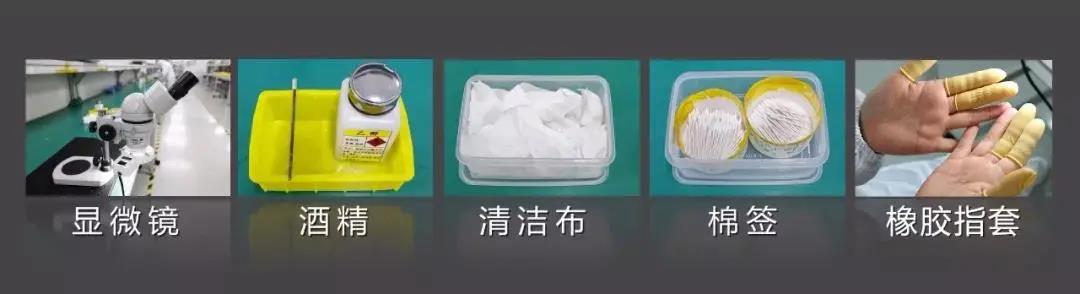 (4)壓(yā)縮(suō)空(kōng)氣(無油,無水),或用(yòng)雙麵膠裏層(céng)的膠布卷成的木棒;